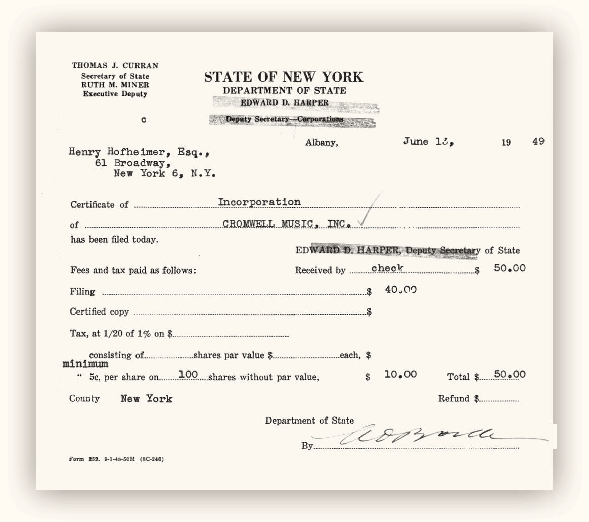 Howie’s first publishing company, Cromwell Music, Inc., opened on West 57th Street on June 13, 1949, and six months later, Guy Lombardo’s recording of "Hop-Scotch Polka" reached the #16 slot on the Billboard charts. Working with his longtime assistant, Irene Kelsey, Howie was soon joined by Al Brackman, and their joint love affair with songwriters and musicians began.