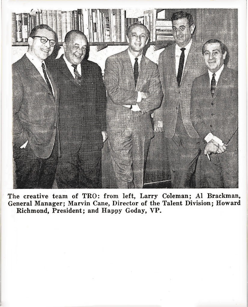 With activities developing on many fronts, Howie restructured his firm under the banner of The Richmond Organization, or simply TRO, and began working with Mitch Miller and other record producers who were turning to TRO for new material. Under the TRO umbrella, more publishing companies were created, including Hollis Music, Inc., Ludlow Music, Inc., Hampshire House Publishing Corp., Folkways Music Publishers, Inc., and Essex Music, Inc.