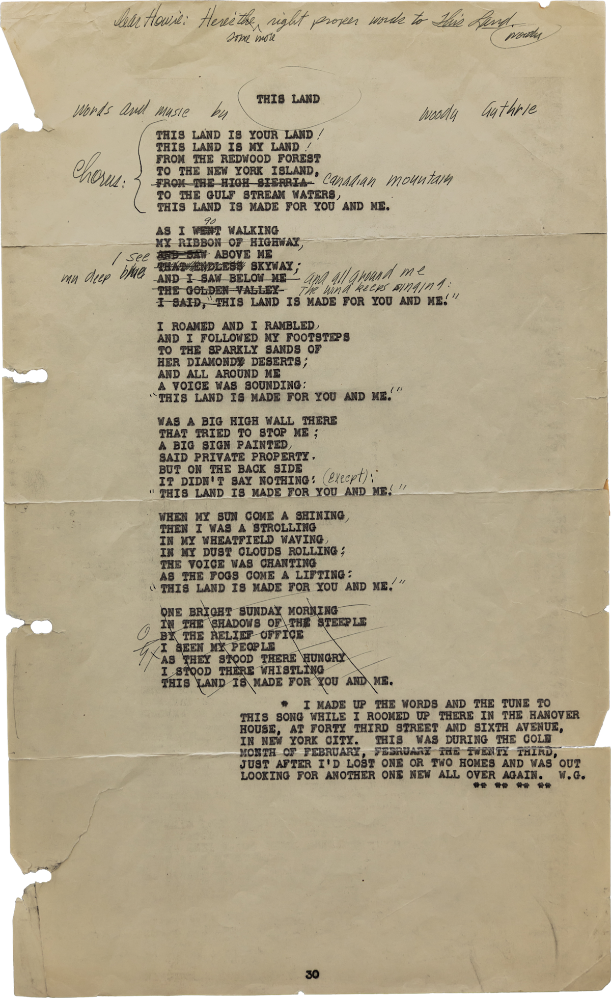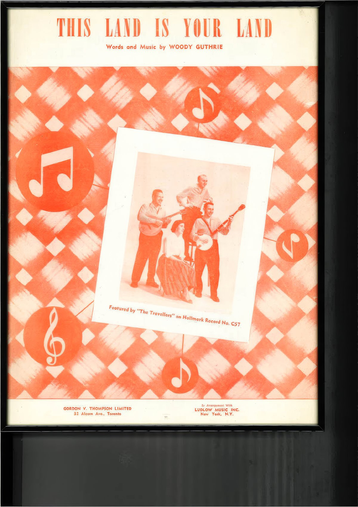 In Woody’s collection of over three thousand songs were stories of common people and their struggles. His songs offered inspiration and hope. One song in particular, "This Land Is Your Land," was written in response to Irving Berlin’s “God Bless America.” In order to get the song circulated, TRO gave a gratis license to print the work in schoolbooks, and soon the song was being taught to children throughout America. By the end of the decade, "This Land Is Your Land" was being sung across the country.