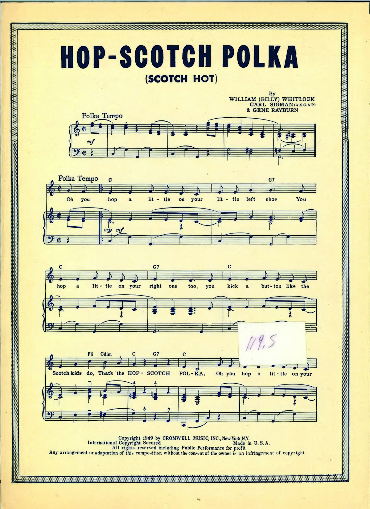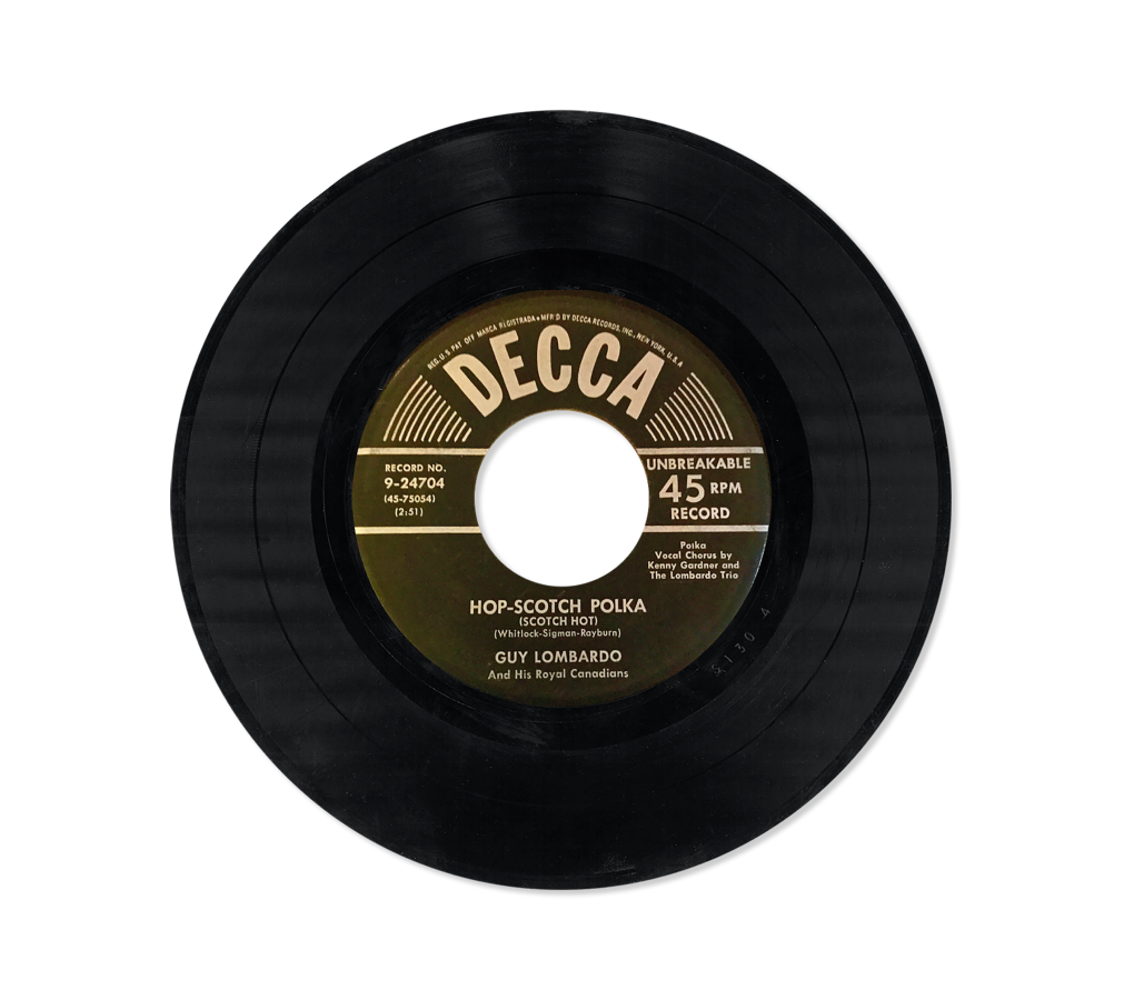 We started with one song called "Hop-Scotch Polka," which I found from two disc jockeys, Gene Rayburn and Dean Finch. They were playing the equivalent of a London record Billy Whitlock had done on this old cylinder disc, and Decca had put it out on their English label. Rayburn said, "Can you do something with it?" At the time, I was doing some publicity for the Big Three, and I thought this is a cute little song for somebody. Mr. Olman over there said, "Not for us because we’re working on something else with Harry Warren." I went to my friend Carl Sigman and said, "What do you think of this one?" and Carl said, "Hop-Scotch Polka."