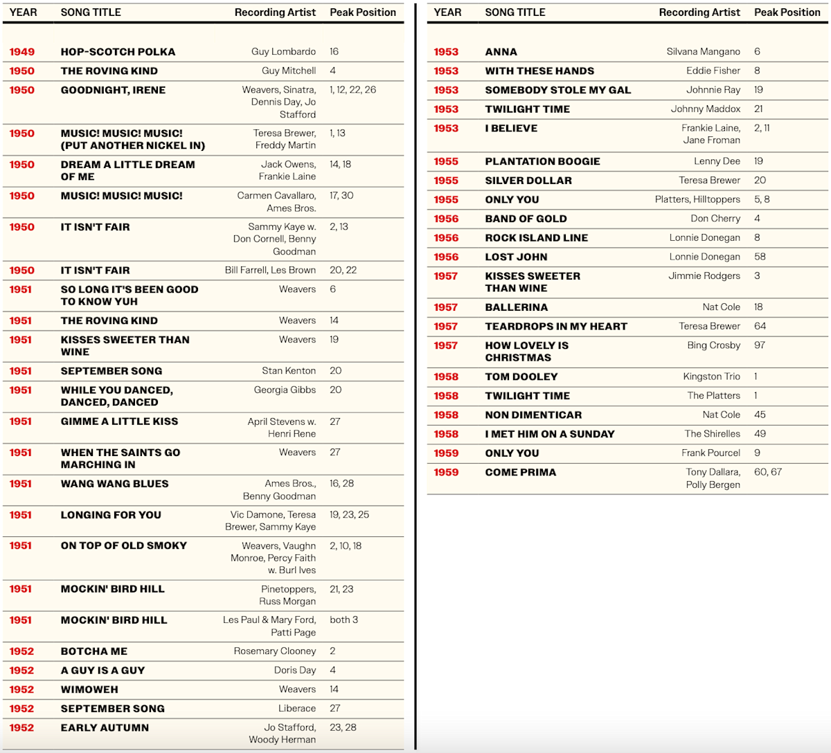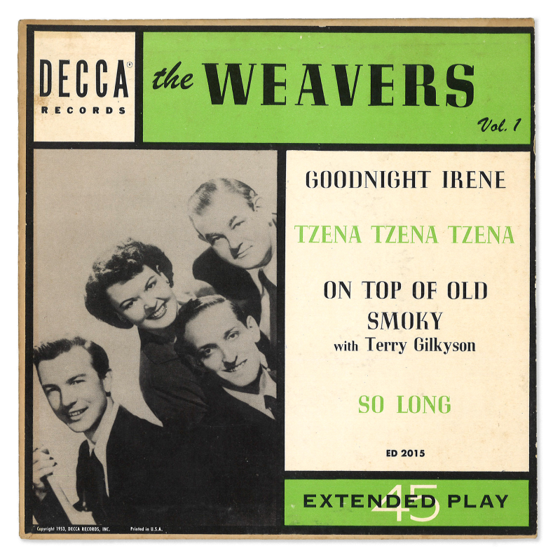 The Weavers followed up "Goodnight Irene" with "On Top of Old Smoky" (#2), "Kisses Sweeter Than Wine" (#19), "The Roving Kind" (#14), and "So Long, It’s Been Good to Know Yuh" (#6). However, in 1955, the House Un-American Activities Committee (HUAC) subpoenaed Pete Seeger to testify during the McCarthy era, and the Weavers were blacklisted and unable to perform or have their songs played on the radio or jukeboxes. TRO supported Pete and the Weavers with advances on the songs they were writing during the blacklist, which eventually ended, allowing Pete Seeger and the Weavers to perform again.