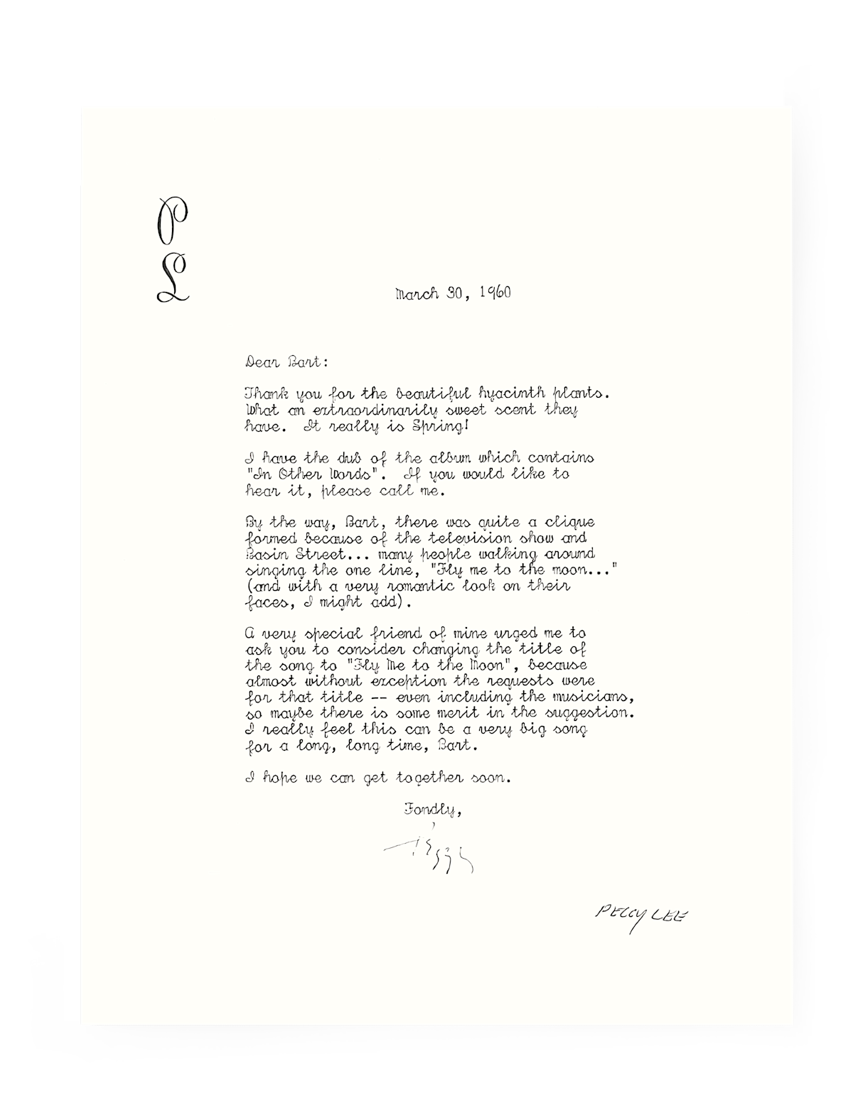 Peggy wrote to Bart, encouraging him to change the title. “Everywhere you go downtown, people are talking about this song,” she said to him, “but you have to change the title.” The song was officially changed to "Fly Me to the Moon (In Other Words)" a decade after it was originally written and was famously recorded by Frank Sinatra and Count Basie in 1964. In 1969, the Sinatra recording was played by Neil Armstrong during the moon landing.