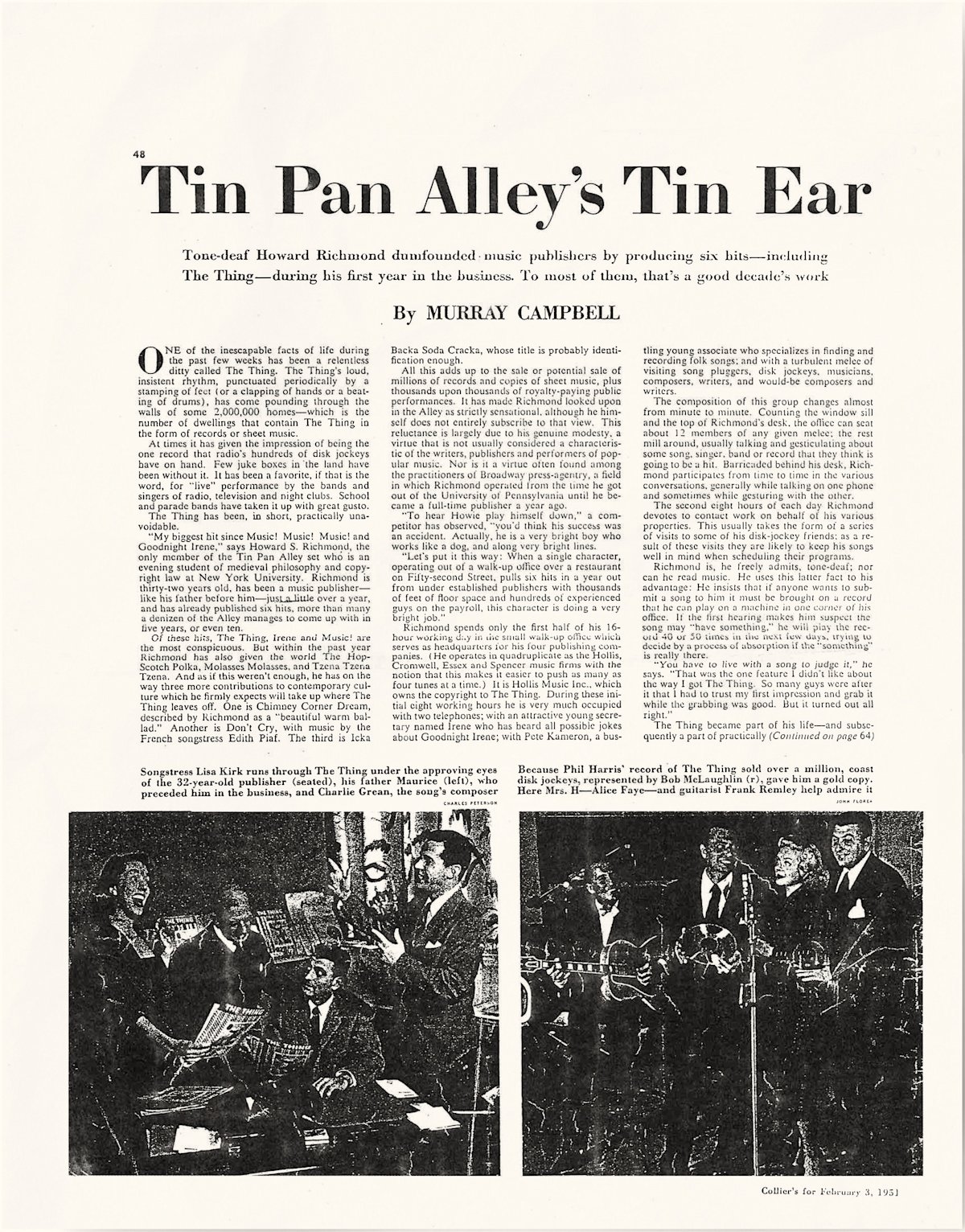 On the heels of the success of "Hop-Scotch Polka," TRO continued to have great success on the pop charts. "Music! Music! Music! (Put Another Nickel In)," written by Stephan Weiss and Bernie Baum and recorded by Teresa Brewer, was TRO’s first No. 1 hit song. Guy Mitchell’s recording of "The Roving Kind" was the next big success, and Phil Harris’ recording of "The Thing" topped the charts in December 1950.