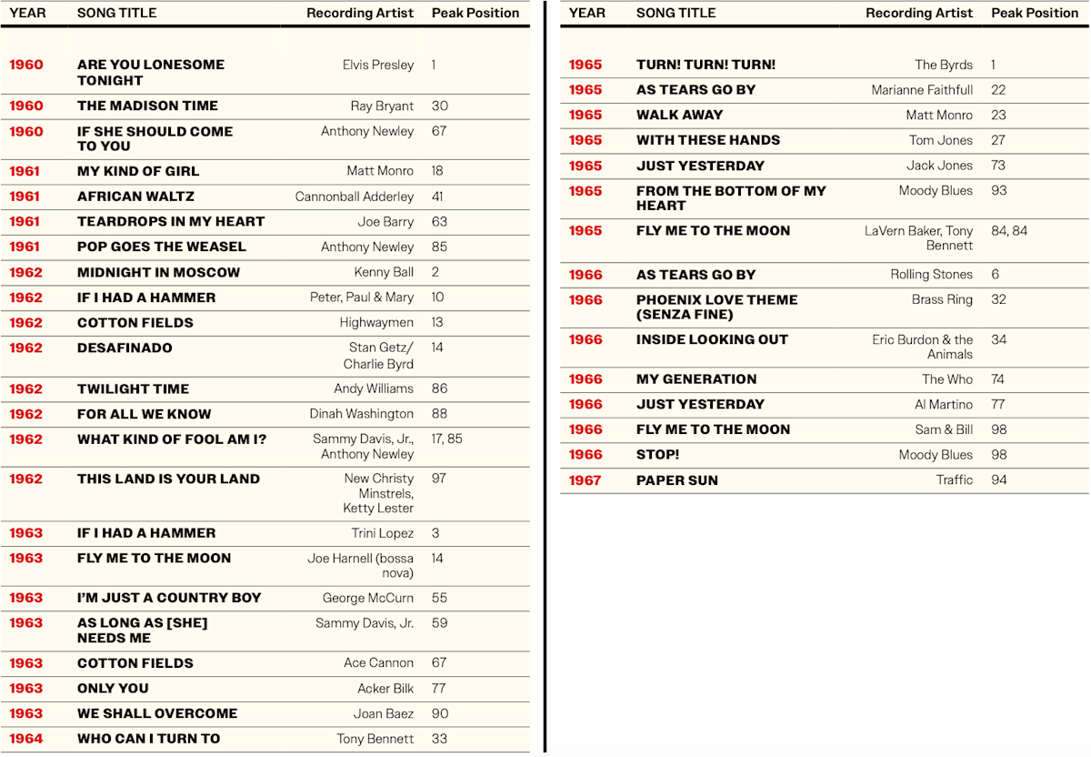 The 1960s opened with a No. 1 hit recording by Elvis Presley of "Are You Lonesome Tonight." Originally written by Roy Turk and Lou Handman in 1926, Elvis’ recording made it an international hit, selling over two million copies and was certified double platinum in both the US and UK. In the US, the 1960s were a time of protest, and "We Shall Overcome" became the rallying cry for the Civil Rights Movement. Other protest songs were also published by TRO, including "If I Had a Hammer (The Hammer Song)" written by Lee Hays and Pete Seeger, which Trini Lopez and Peter, Paul and Mary both recorded and charted with; "Tear Down the Walls" was written by songwriter Fred Neil; and folk rock was born when The Byrds recorded Pete Seeger’s "Turn! Turn! Turn! (To Everything There Is a Season)," which hit number one on the Billboard charts and is one of the enduring anthems from the civil rights era.