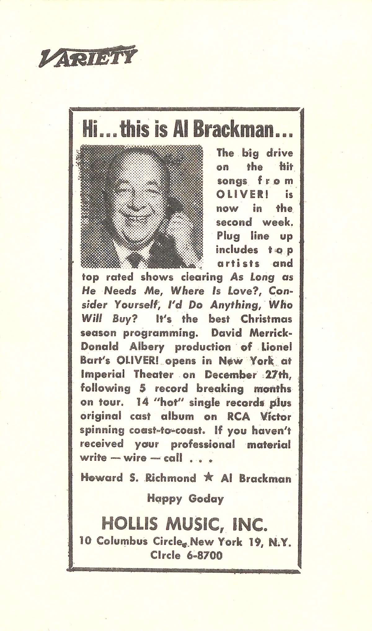 TRO would work with Merrick again to produce Lionel Bart’s "Oliver!" The show originally opened at the New Theatre in London, and three years later, it started its historic run on Broadway. The original Broadway production of "Oliver!" would go on to win the Tony Award for Best Original Score, and in 1968, the film version won six Academy Awards, including Best Picture. It produced songs including "Food, Glorious Food," "I’d Do Anything," "Consider Yourself," and "As Long As He Needs Me."