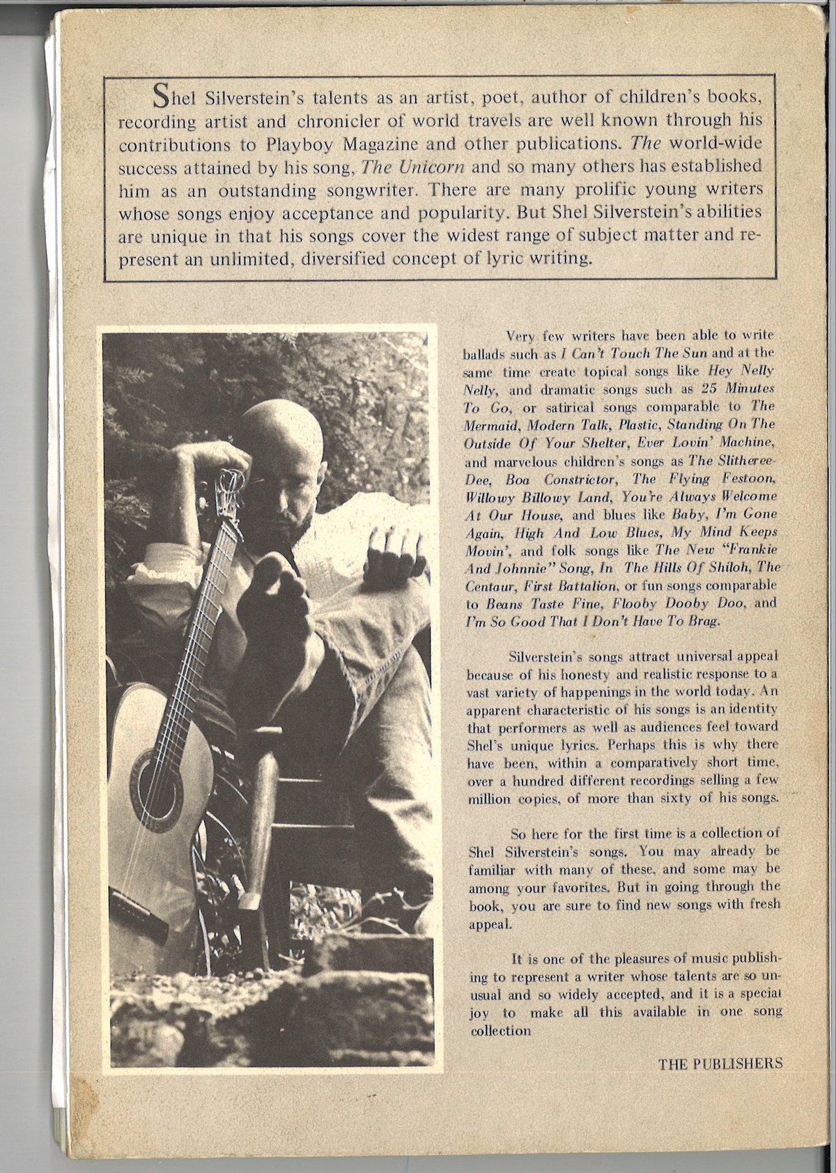 As a songwriter, Shel’s catalog included songs like "25 Minutes to Go," "One’s on the Way," "Sylvia’s Mother," "The Unicorn," "Cover of the Rolling Stone," and "A Boy Named Sue," recorded in 1969 by Johnny Cash, which became a crossover hit peaking at No. 2 on the Billboard Hot 100. Shel’s songs have been recorded and popularized by a wide range of other acts, including Loretta Lynn, Tompall Glaser, The Irish Rovers, and Dr. Hook & the Medicine Show.