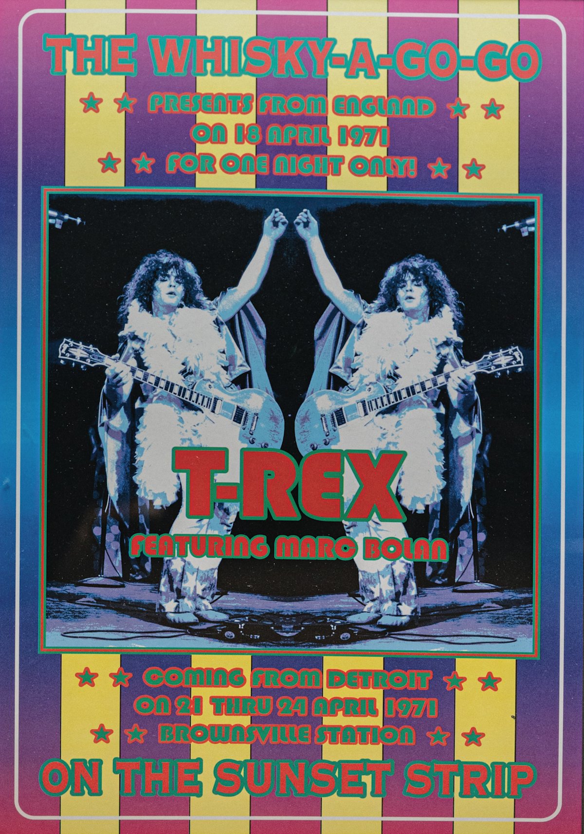 In the early to mid-1970s, Marc Bolan and T. Rex reached huge success with fourteen top 20 UK hits, including "Jeepster," "Bang a Gong (Get It On)," "Ride a White Swan," "Hot Love," and "Cosmic Dancer." During this period, the band also released six UK top 30 albums, including "Electric Warrior," which reached the top of the album charts. With their success on radio and on record, the band became regulars on Peel Sessions on BBC radio and toured Britain’s student union halls.