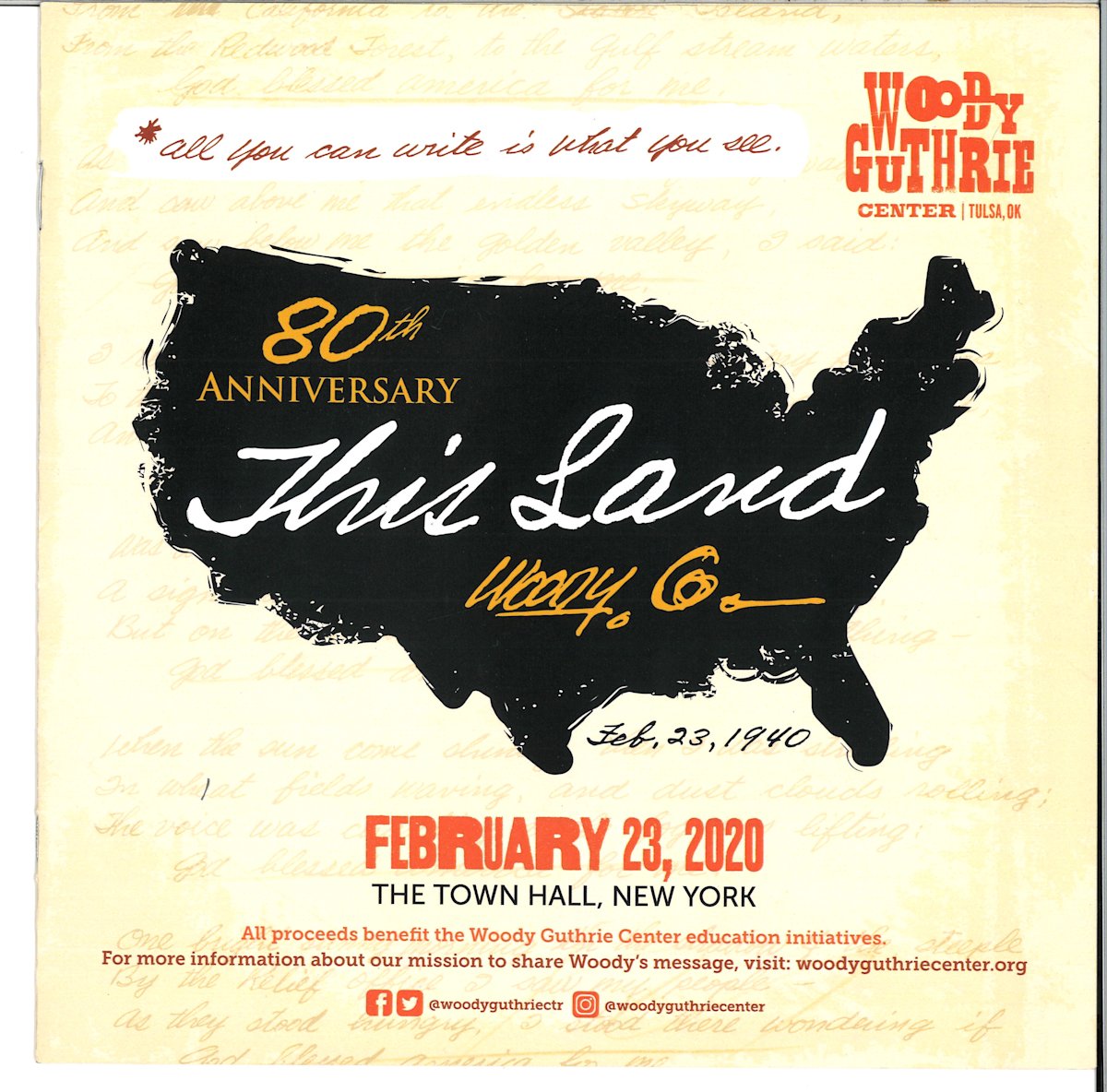 At the 2008 inauguration of President Barack Obama, Bruce Springsteen and Pete Seeger performed "This Land Is Your Land" at the US Capitol. In 2012, a yearlong celebration culminated with the opening of the Woody Guthrie Center in Woody’s hometown of Tulsa, Oklahoma. The Center celebrates not only Woody’s contributions to folk music, but also those of Pete Seeger, Bob Dylan, Lead Belly, Oscar Brand, and many others.